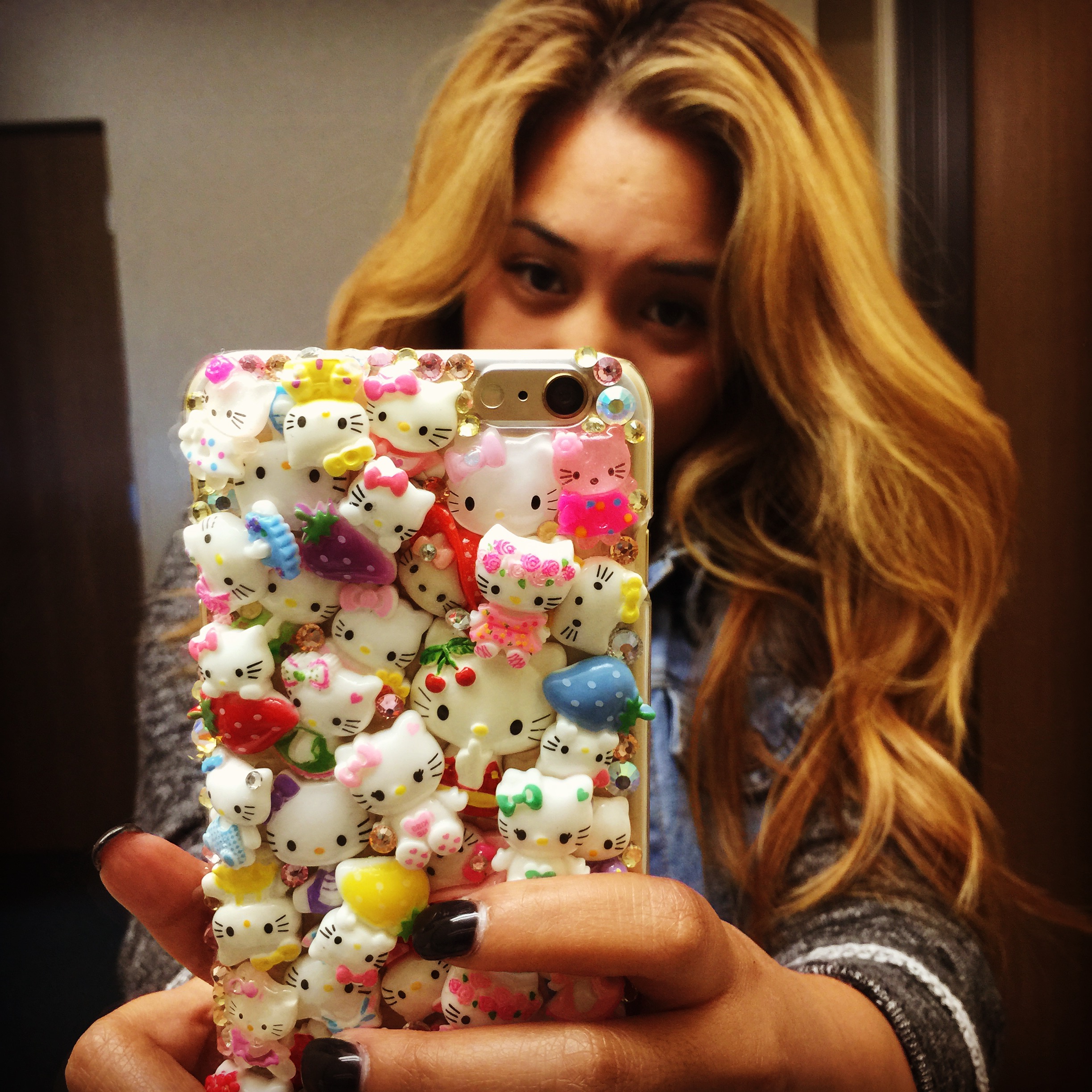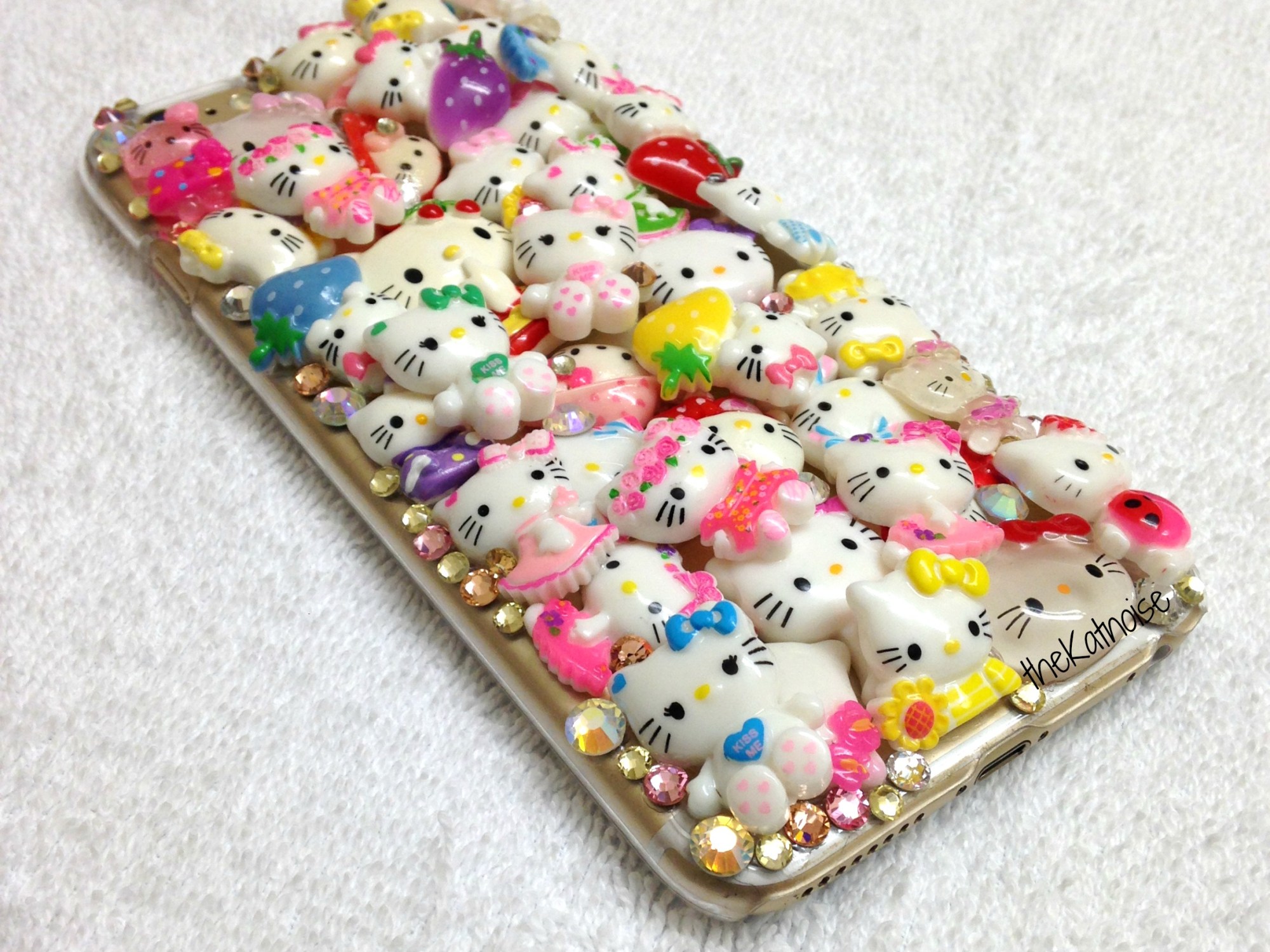 It’s a phone case covered in Hello Kitty cabochons with Swarovski crystal components. There’s a lot going on, but it works.