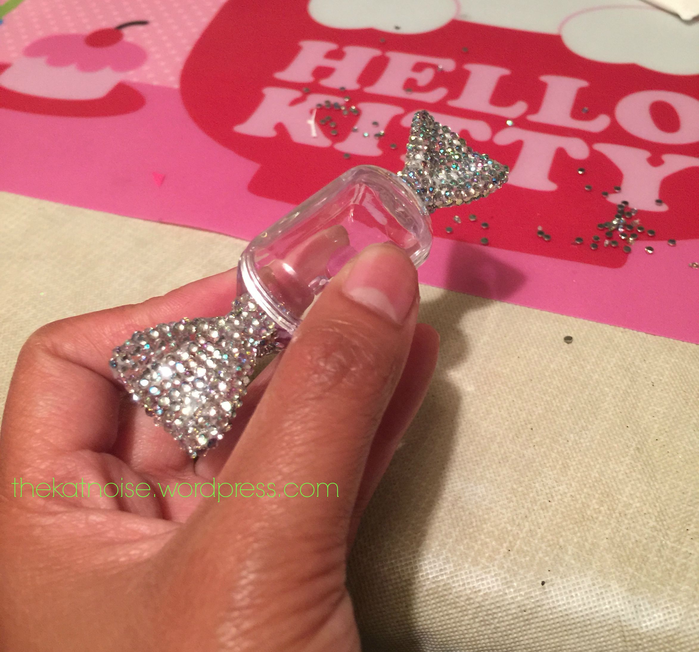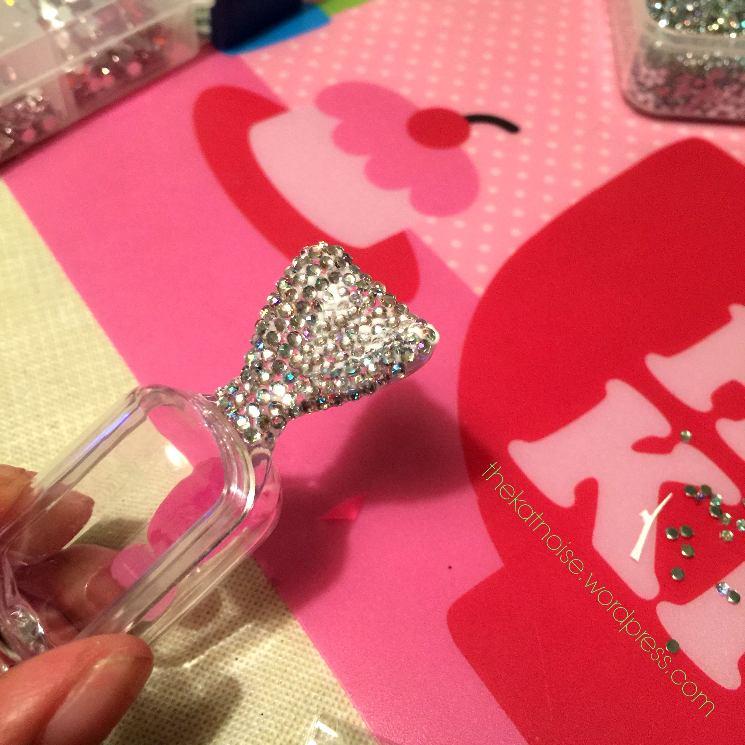 I didn’t mean to, but I totally forgot to take more progress pictures. This is the bottom of the box. After finishing the sides of the box, I rhinestoned the front and back lengths of the box. I chose to leave the bottom un-stoned so I could see the contents.