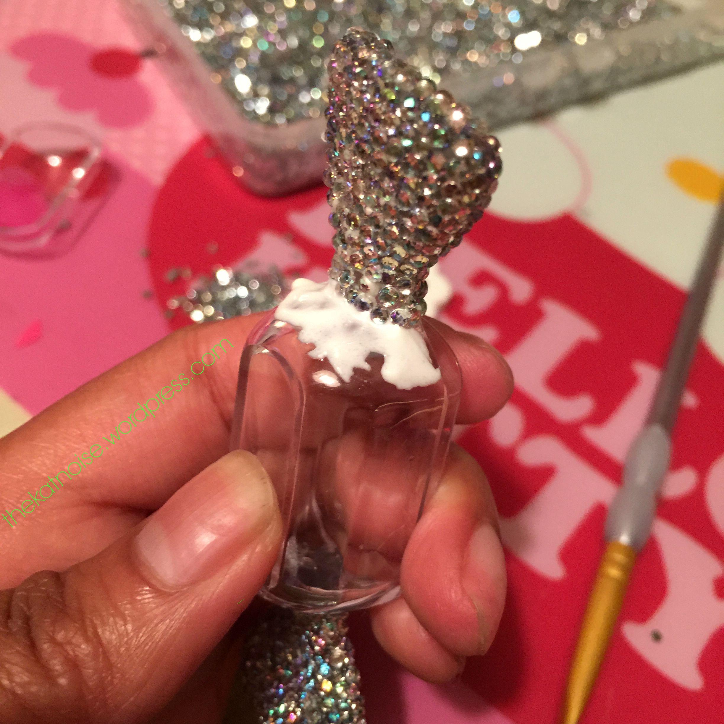 I approached the lid the box the same way. I started with the sides and then did the middle while minding the lid closure area. This was probably the most tricky piece to hold. I would recommend thin layers of adhesive to allow the rhinestones to set faster, allowing you to hold the lid with ease. If you find the gems shifting while you’re handling the lid. Take a break, have a diet coke, check your email and then come back to the grind.