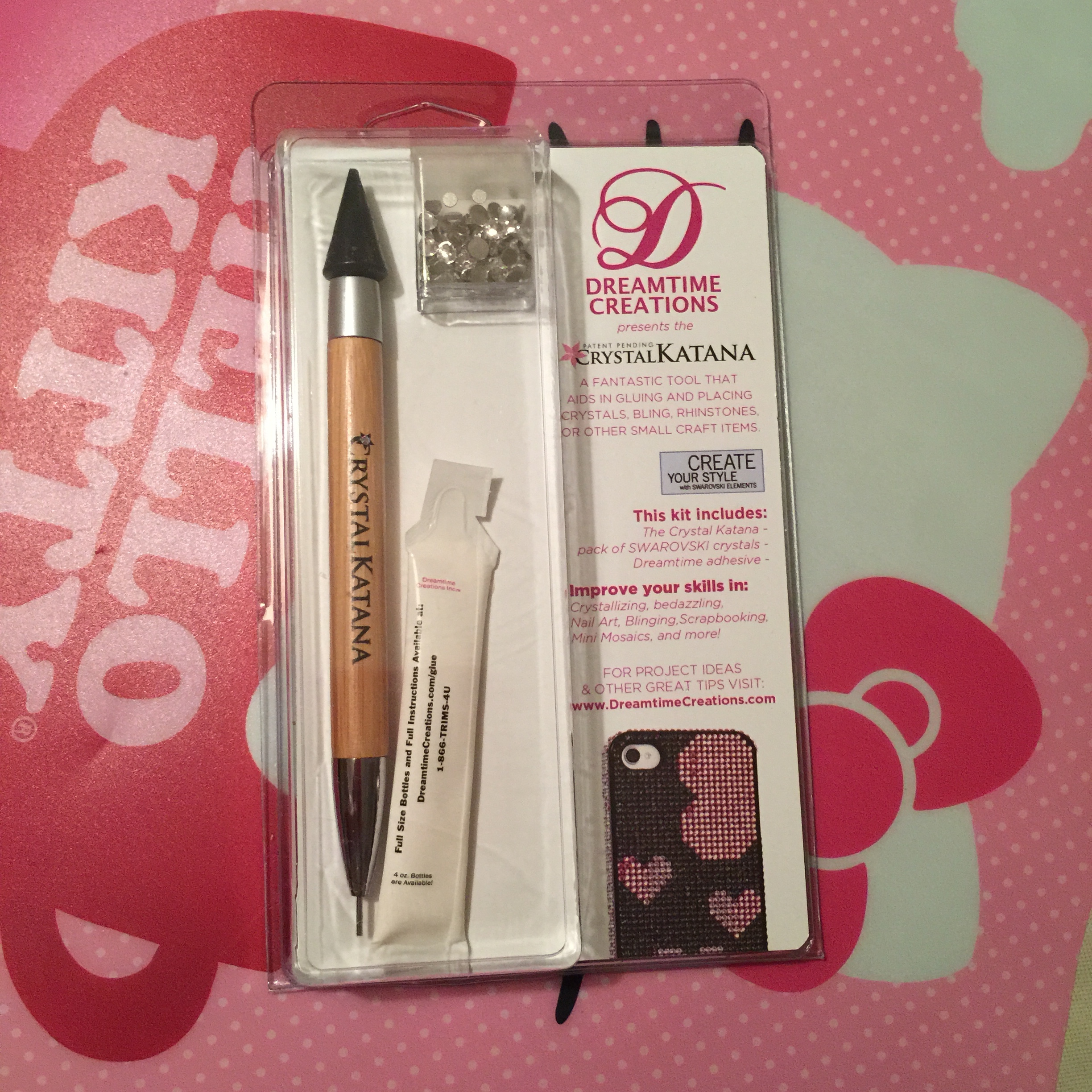 The Crystal Katana is definitely a lovely weapon that would be great to have in your crafting arsenal. The package came with adhesive and a container of Swarovski flat back crystal rhinestones. I contacted their customer care and was told the glue was Gem-Tac. I did not use the crystals included in the package. I will use them for something else in the future. Instructions state exactly what size rhinestones you should use with this. As terrible as this sounds, I really didn’t want to like this deco tool. It’s body is wooden and light. The Crystal Katana is about the size of a fat washable crayola marker. This had an optional case as an additional purchase, but I really couldn’t understand why I should buy the case. I felt like I was being nickeled and dimed. Also, replacement tips are available. Sheesh.